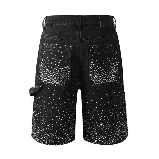 Luxury Hip Hop Denim Shorts with Glittering Rhinestone Embellishments and Vintage Washed Look 5102