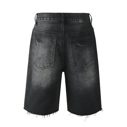 Casual Streetwear Denim Shorts for Men Featuring Distressed Detailing, Raw Cut Hem, and Faded Wash 5091