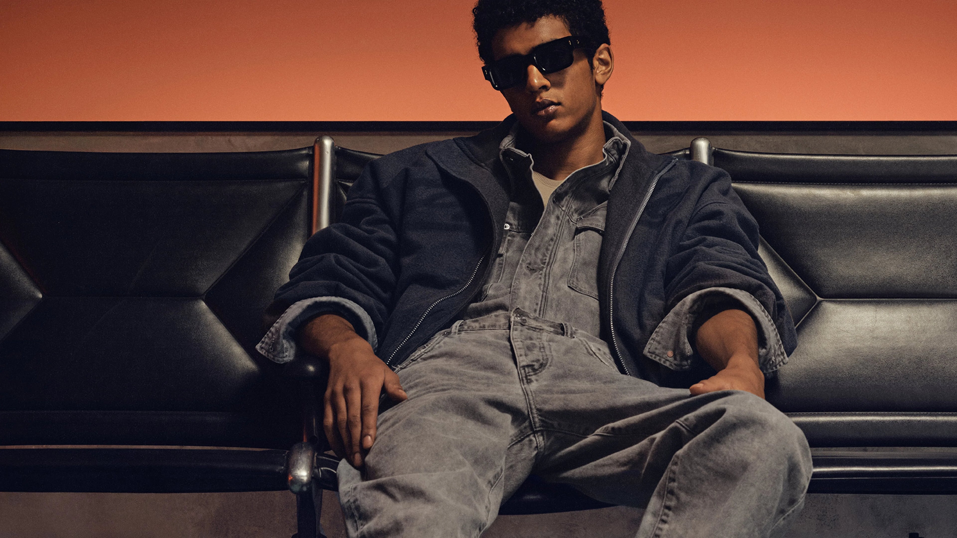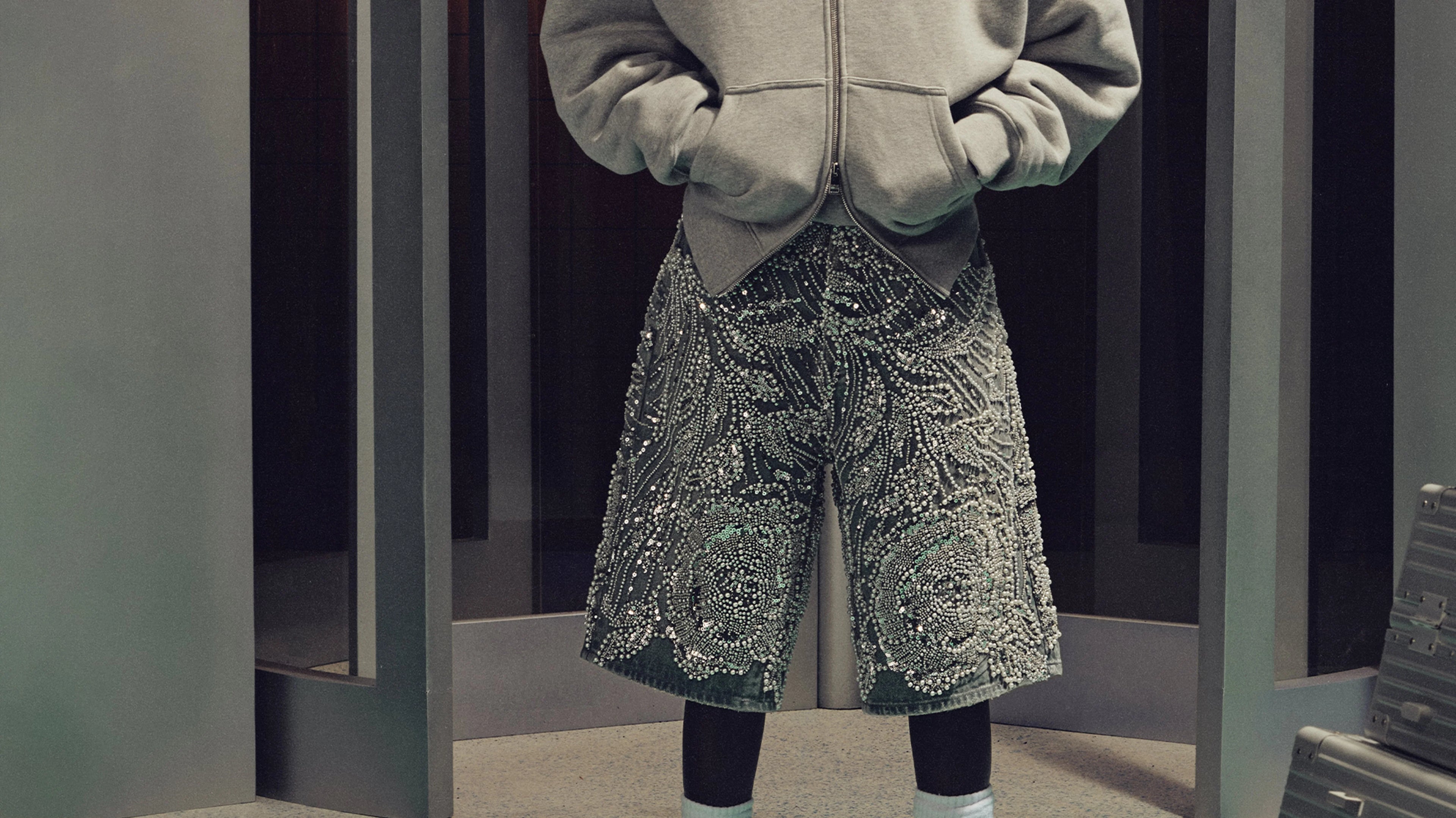 Jean streetwear oversize pour homme, noir vintage, avec détails pailletés sur toute la longueur et style urbain luxueux 105