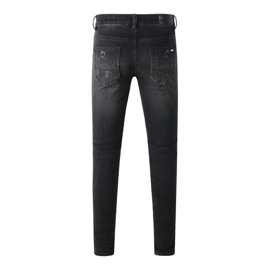 Men's Slim Fit Black Jeans with Street Style Patches, Vintage Wash, and Ripped Details 6848