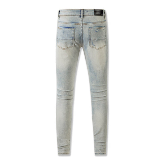 Trendy Light Blue Jeans for Men Slim Fit with Black Print Elements and Allover Crystal Details 9127