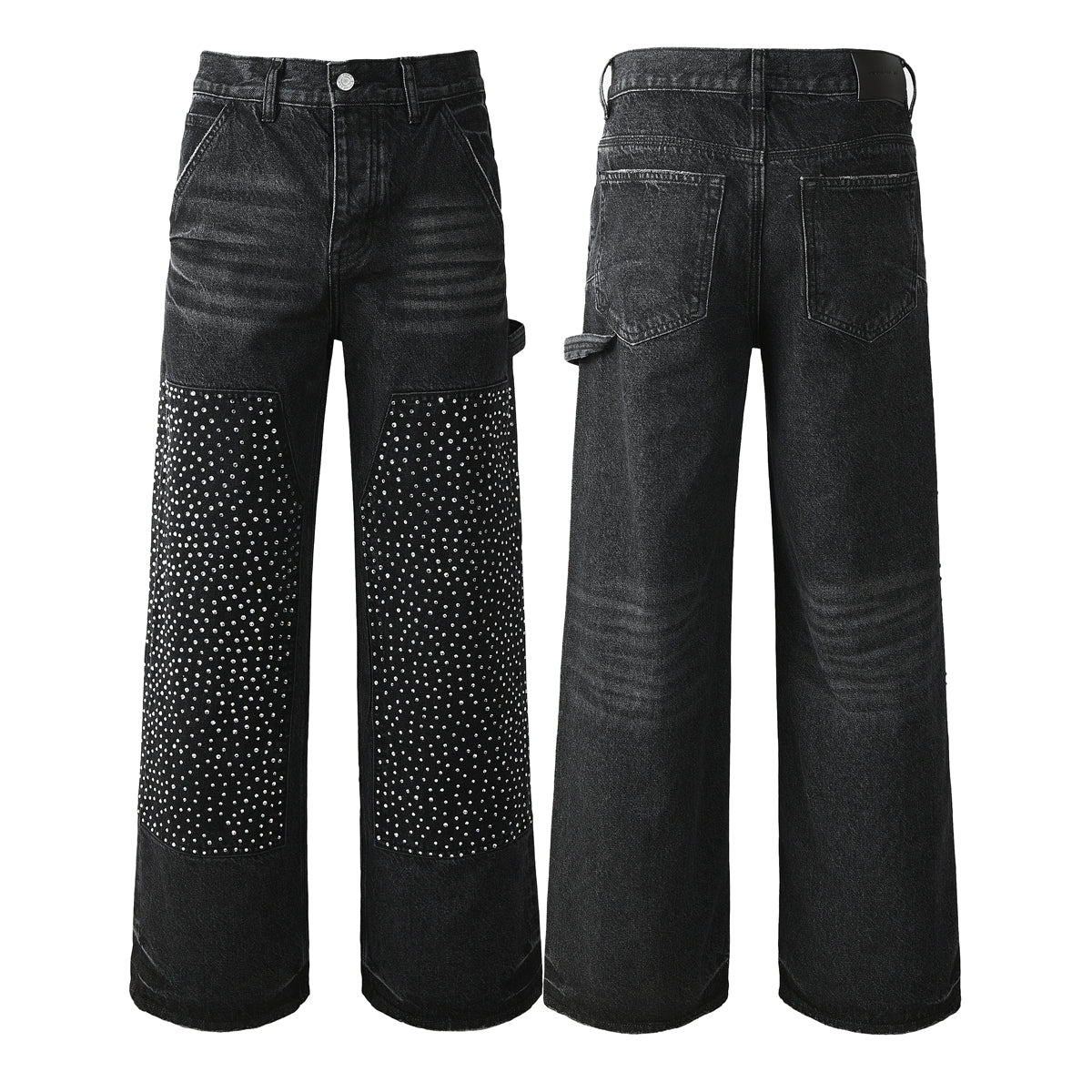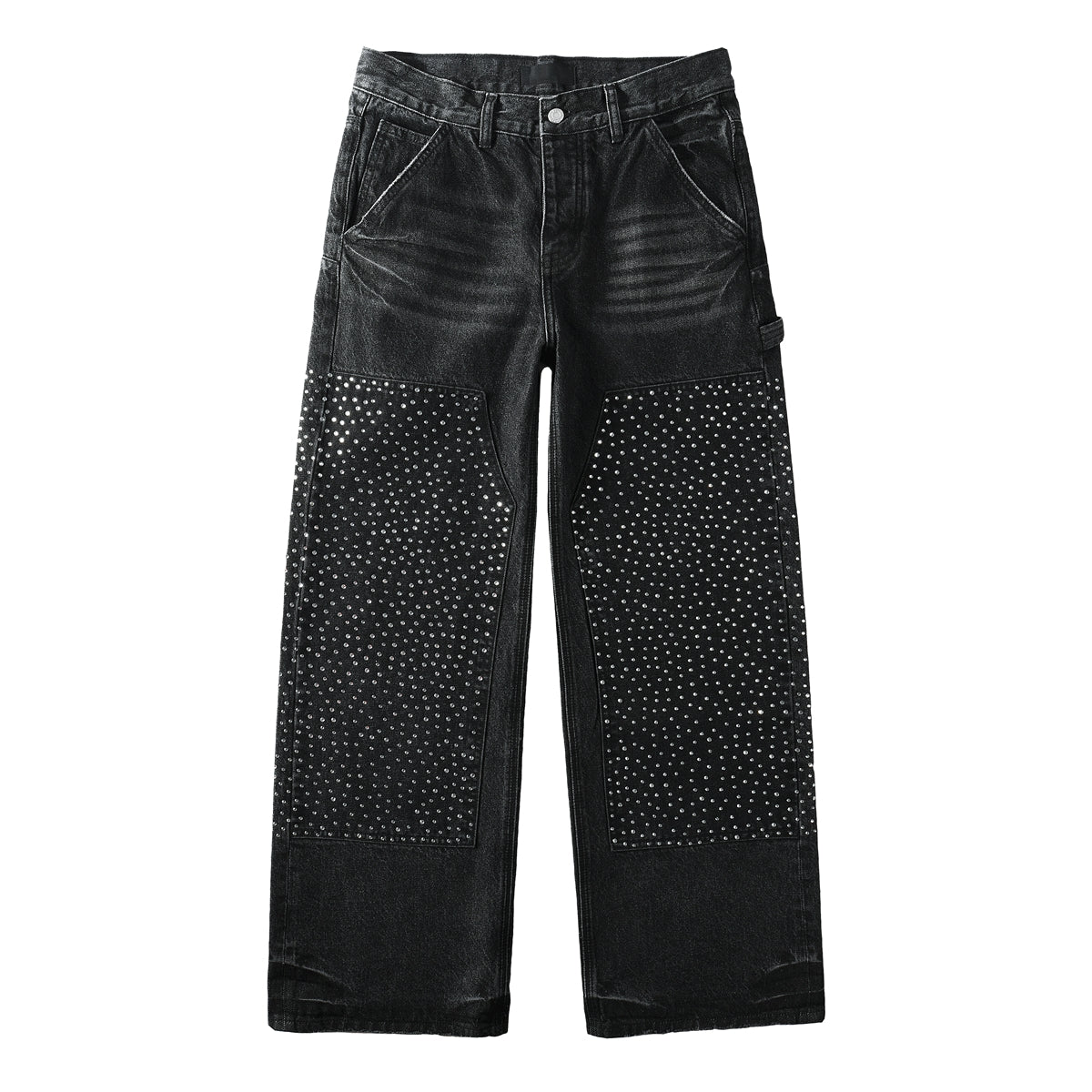 Men's Wide Leg Black Denim Jeans with Studded Front Panels and Streetwear Workwear Inspired Design 104