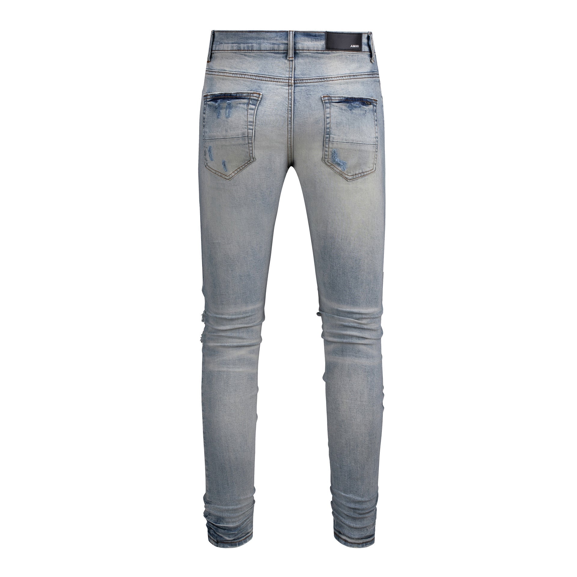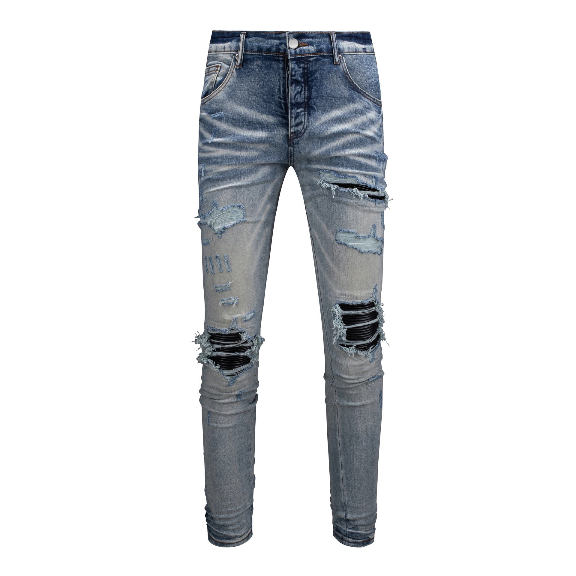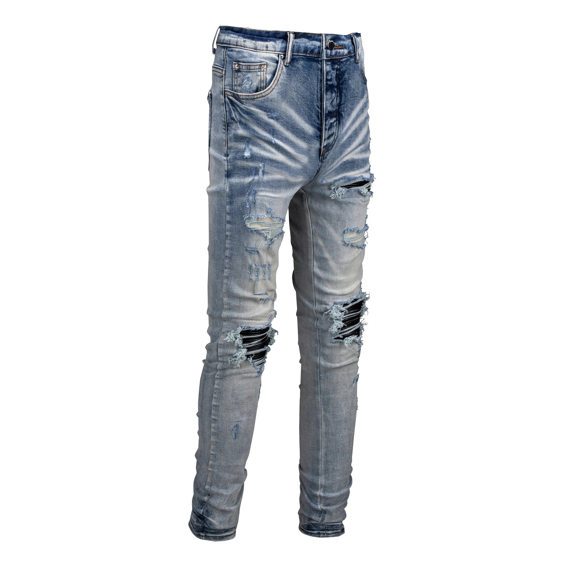 Men's Slim Fit Black Jeans with Street Style Patches, Vintage Wash, and Ripped Details 6848