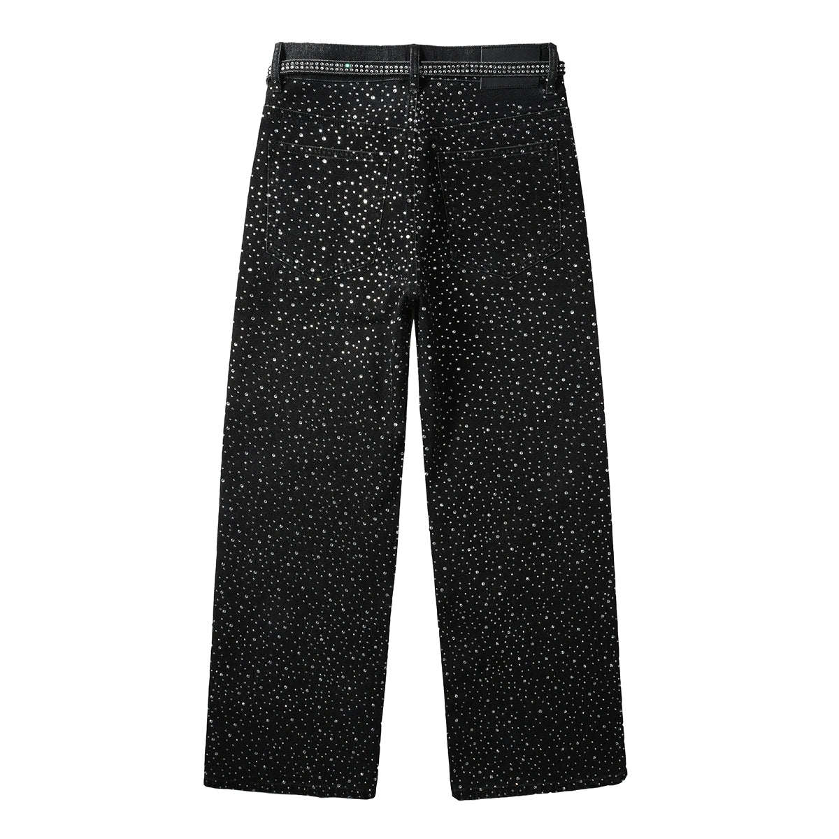Trendy Mens Loose Fit Black Jeans Allover Sparkling Crystal Studs and Decorative Front Straps 9128