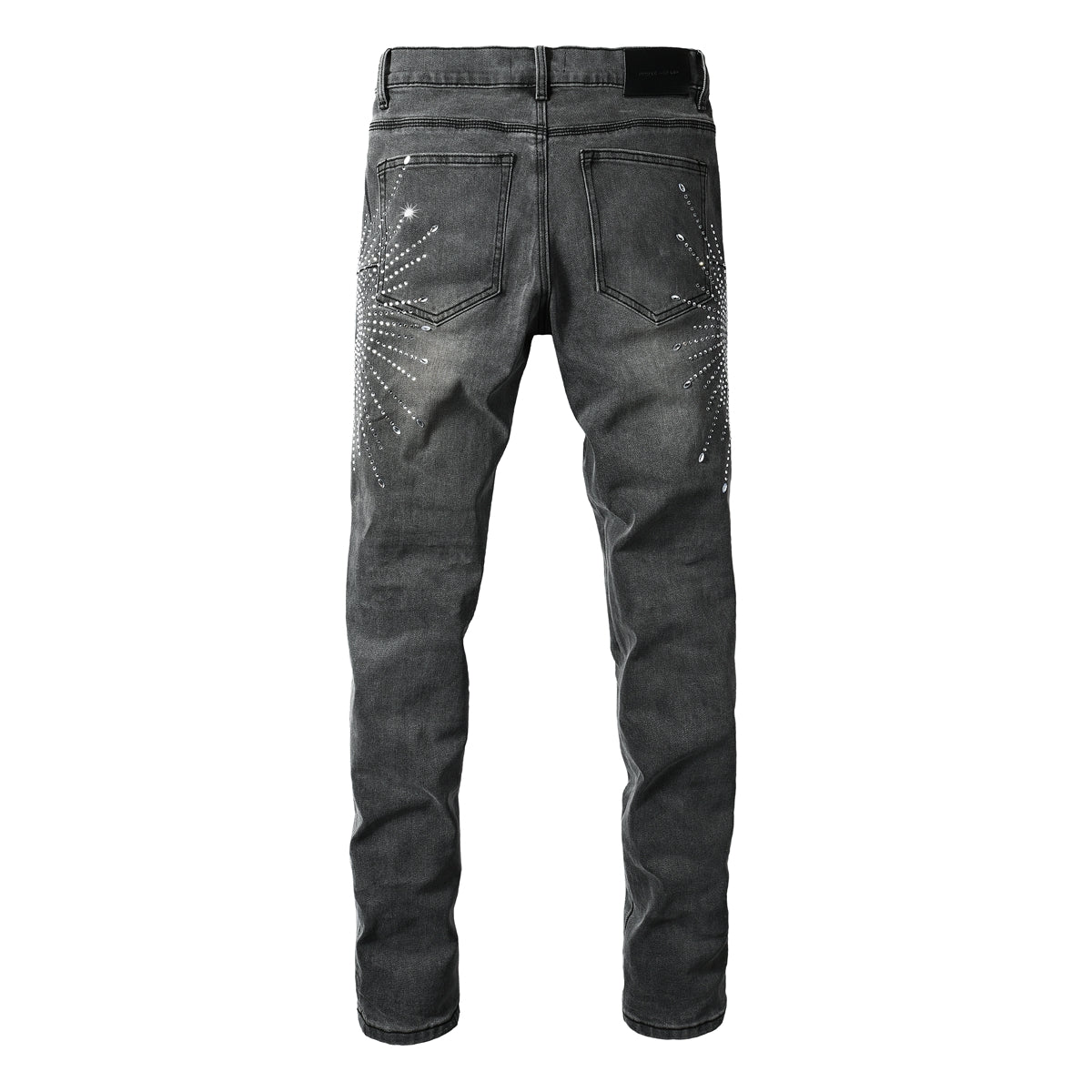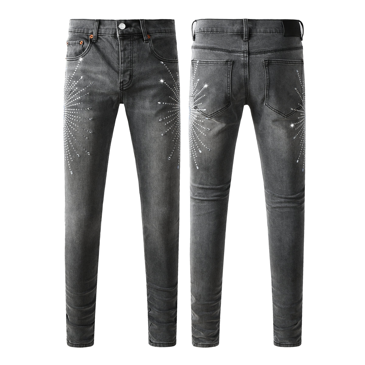 Trendy Slim Fit Grey Jeans for Men Featuring Shiny Rhinestone Starburst Pattern on Front and Back 9123